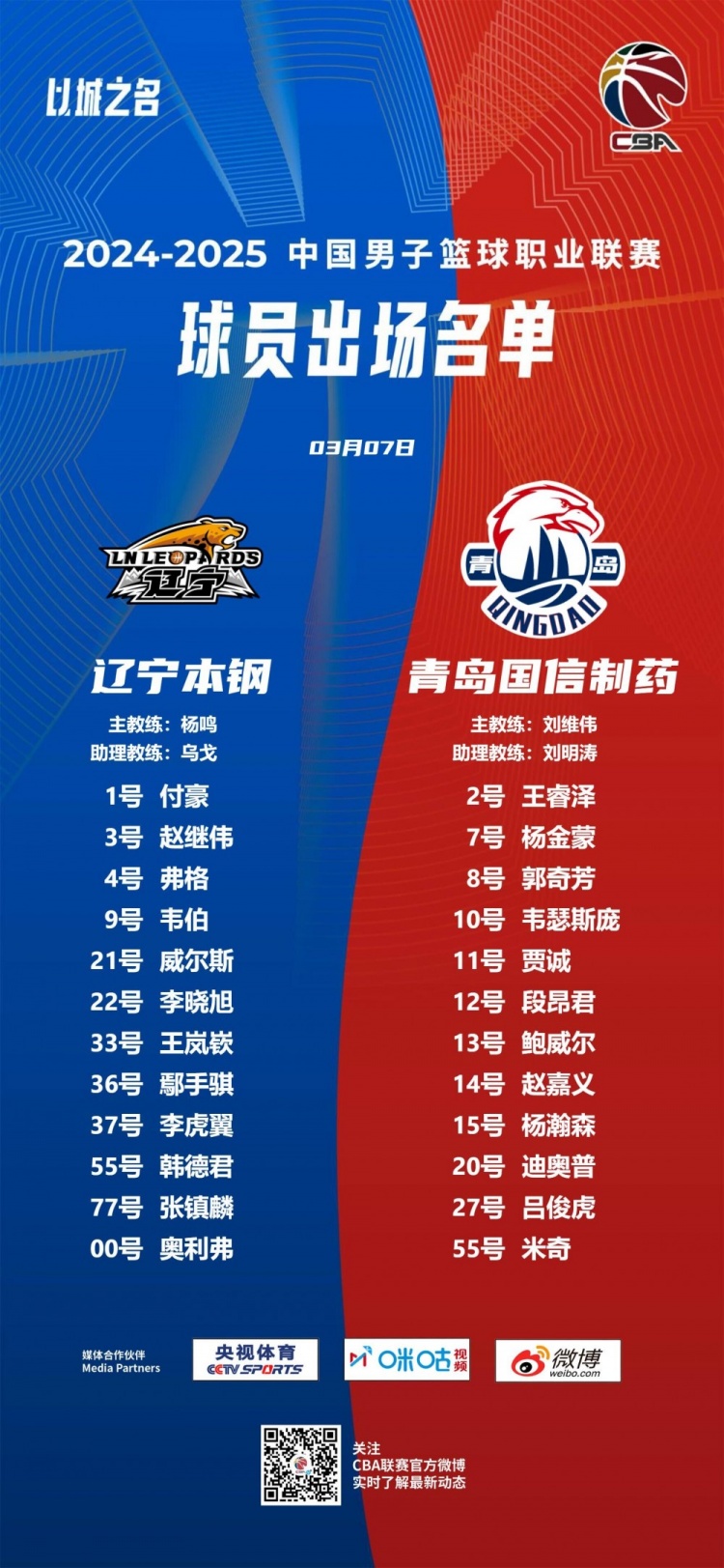 遼寧大名單:付豪、趙繼偉、弗格、韋伯、威爾斯、李曉旭、王嵐嵚、鄢手騏、李虎翼、韓德君、張鎮(zhèn)麟、奧利弗。
