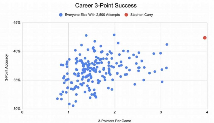 庫(kù)里的獨(dú)特之處不僅在于他投的三分球比任何人都多,還在于他能以令人難以置信的效率命中這些三分出手。在職業(yè)生涯至少出手2500記三分球的198名球員中,庫(kù)里的三分命中率排名第三(42.4%),僅次于凱爾-科沃爾和史蒂夫-納什。