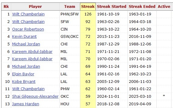 據(jù)統(tǒng)計(jì),這是亞歷山大連續(xù)第60場比賽砍下20+,他也成為NBA歷史上第8個(gè)做到這點(diǎn)的球員。另外7人分別為:張伯倫、奧斯卡-羅伯特森、杜蘭特、喬丹、賈巴爾、埃爾金-貝勒、科比。