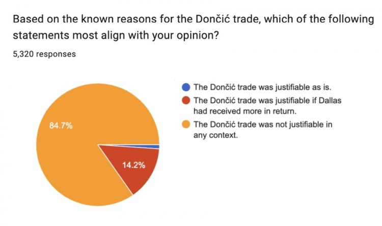 參與問卷調(diào)查的5320名球迷中,84.7%的球迷認(rèn)為東契奇交易在任何情況下都說不過去,14.2%的球迷認(rèn)為如果獨(dú)行俠獲得更多的回報(bào),那么東契奇交易說得過去,認(rèn)為東契奇交易說得過去的球迷只占1.1%。