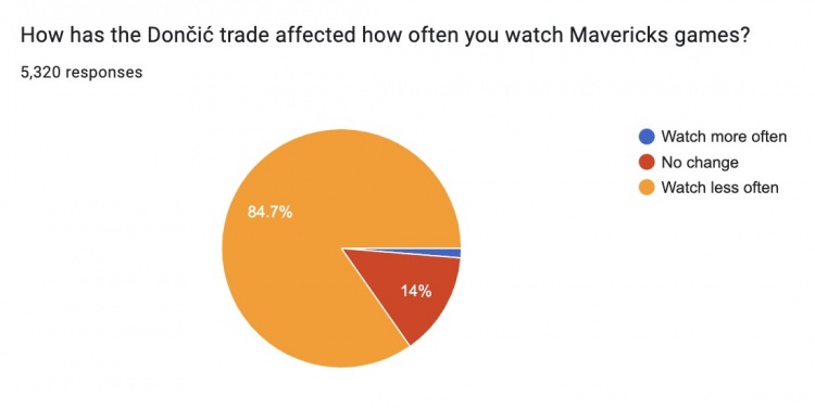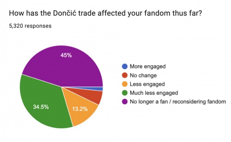 在東契奇交易如何影響你對球隊(duì)的喜愛這個(gè)問題上?45%的球迷表示不再是一名球迷或者要重新考慮自己的喜愛程度;34.5%表示自己現(xiàn)在參與度低多了,13.2%的球迷表示自己參與度略有降低,只有7.3%的球迷表示自己的喜愛度沒有變化或者參與度更高了。