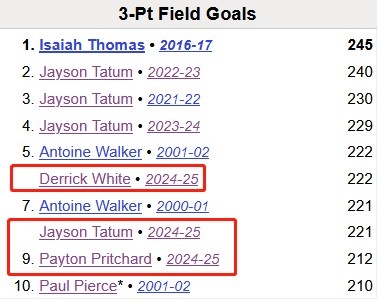 據(jù)統(tǒng)計,本賽季凱爾特人有3員大將有望沖擊隊史單賽季的三分命中數(shù)紀錄,算上今天的數(shù)據(jù),分別為: