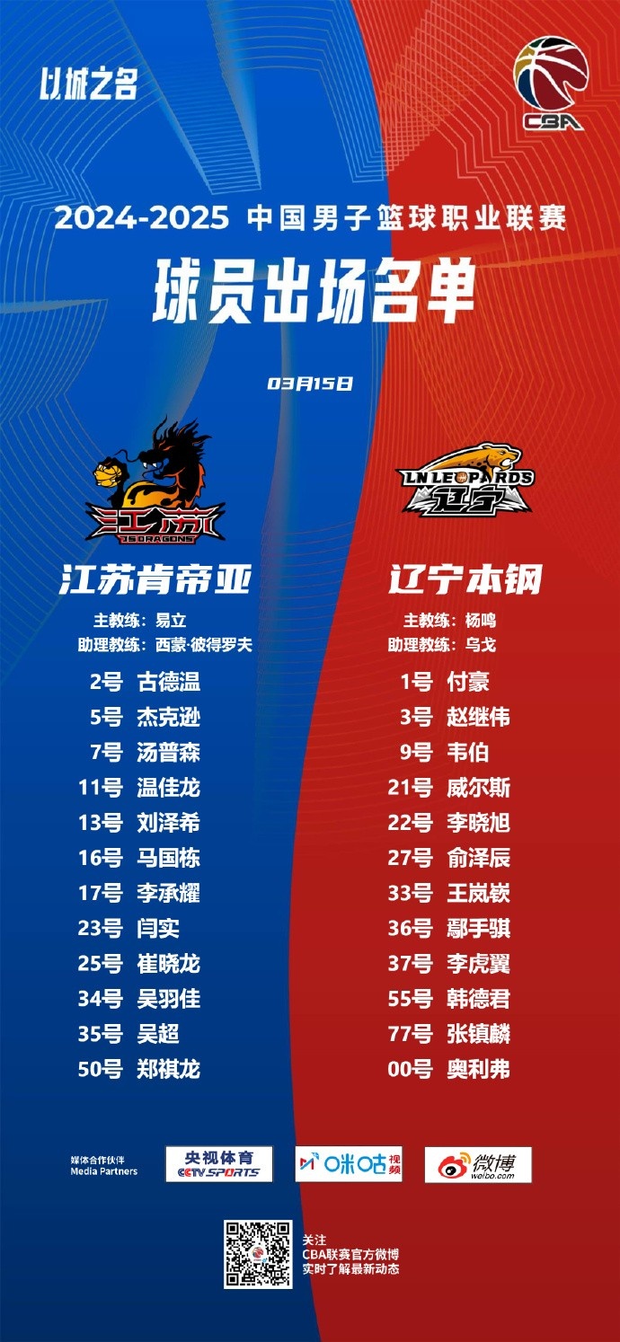遼寧隊(duì):付豪、趙繼偉、韋伯、威爾斯、李曉旭、俞澤辰、王嵐嵚、鄢手騏、李虎翼、韓德君、張鎮(zhèn)麟、奧利弗。