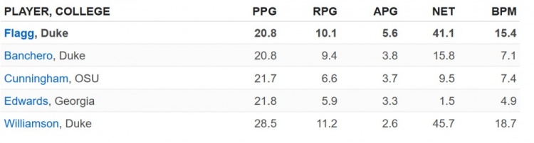 將弗拉格與最近四位來自大學(xué)籃球的NBA選秀狀元——錫安、愛德華茲、康寧漢姆、班凱羅的大一賽季數(shù)據(jù)進(jìn)行標(biāo)準(zhǔn)化對(duì)比(所有數(shù)據(jù)按每40分鐘的產(chǎn)量調(diào)整以確保公平性)。其中NET(凈效率)與BPM(基礎(chǔ)正負(fù)值)等高階數(shù)據(jù)能在一定程度上體現(xiàn)防守影響力: