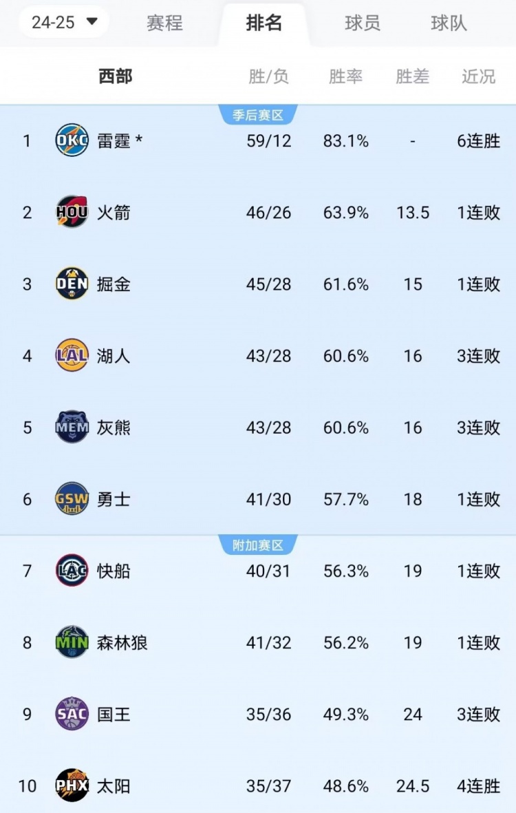 掘金目前排西部第3,勇士第6,快船第7,森林狼第8。