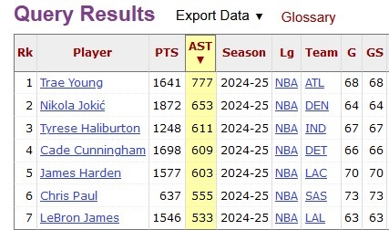 本場過后,特雷-楊本賽季助攻數(shù)逼近800,來到796。他也高居賽季助攻榜首位,比第2名約基奇多了143個!榜單前7名如下: