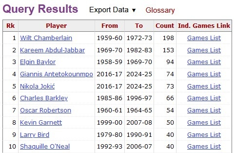 歷史25分15板5助場(chǎng)次榜:張伯倫198次一騎絕塵 字母哥75次第四
