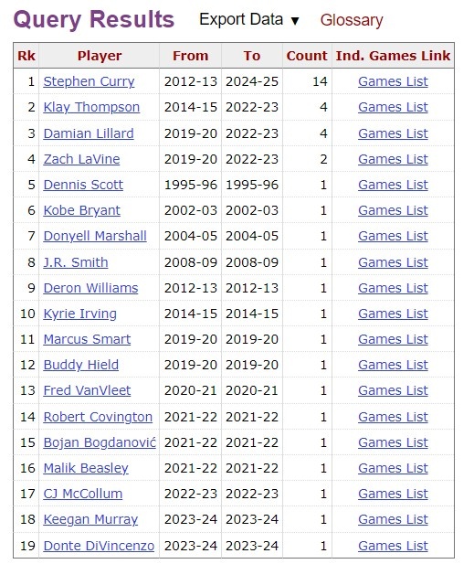NBA歷史單場11+三分場次排行榜:庫里14次第1 超過二三四名總和