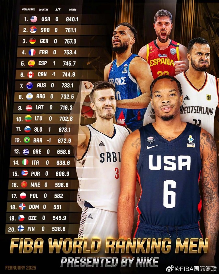 男籃最新世界排名:美國領(lǐng)跑 中國隊(duì)繼續(xù)位列第30 亞大區(qū)排名第6