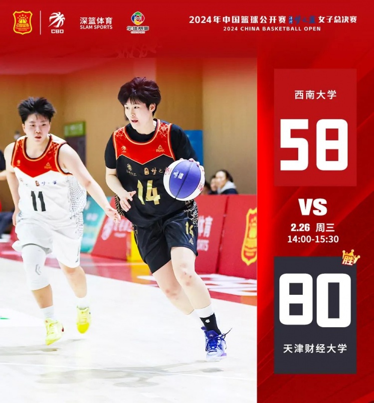 上半場首節(jié),兩隊(duì)打得相對膠著,比分緊咬。第二節(jié),西南大學(xué)手感欠佳,單節(jié)只得到9分。天津財(cái)經(jīng)大學(xué)則保持著不錯的進(jìn)攻勢頭,單節(jié)拿到25分。半場結(jié)束,天津財(cái)經(jīng)大學(xué)37-24領(lǐng)先西南大學(xué)。下半場,西南大學(xué)7號應(yīng)茵、12號莫琇雅前后場籃板拼搶積極,但無奈前期存在一定差距,最終西南大學(xué)58-80不敵天津財(cái)經(jīng)大學(xué)。