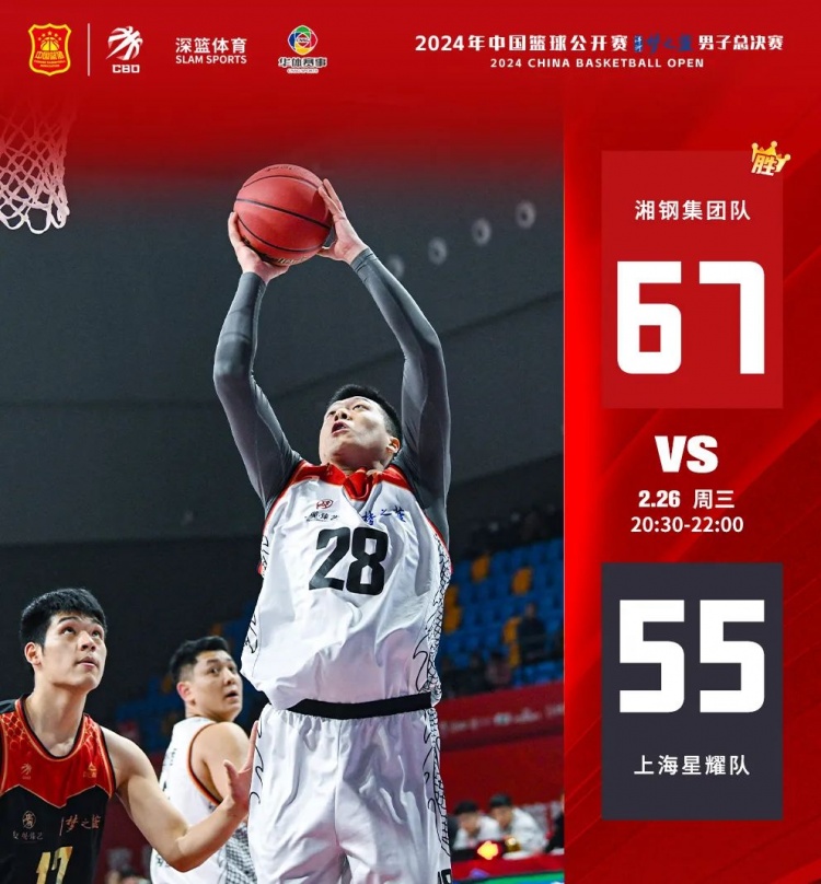 上半場開始,湘鋼集團進攻十分強勢,取得9-4領(lǐng)先。26號陳雙、28號蔡士港相繼投籃命中,上海星耀出現(xiàn)失誤,首節(jié)湘鋼集團24-11領(lǐng)先上海星耀。次節(jié),上海星耀加強防守并在籃板的拼搶中更積極主動。但湘鋼集團沒有給其太多機會,半場結(jié)束,湘鋼集團領(lǐng)先上海星耀16分。下半場,兩隊沒有拉開太大分差,依靠上半場的領(lǐng)先優(yōu)勢,湘鋼集團以67-55戰(zhàn)勝上海星耀。
