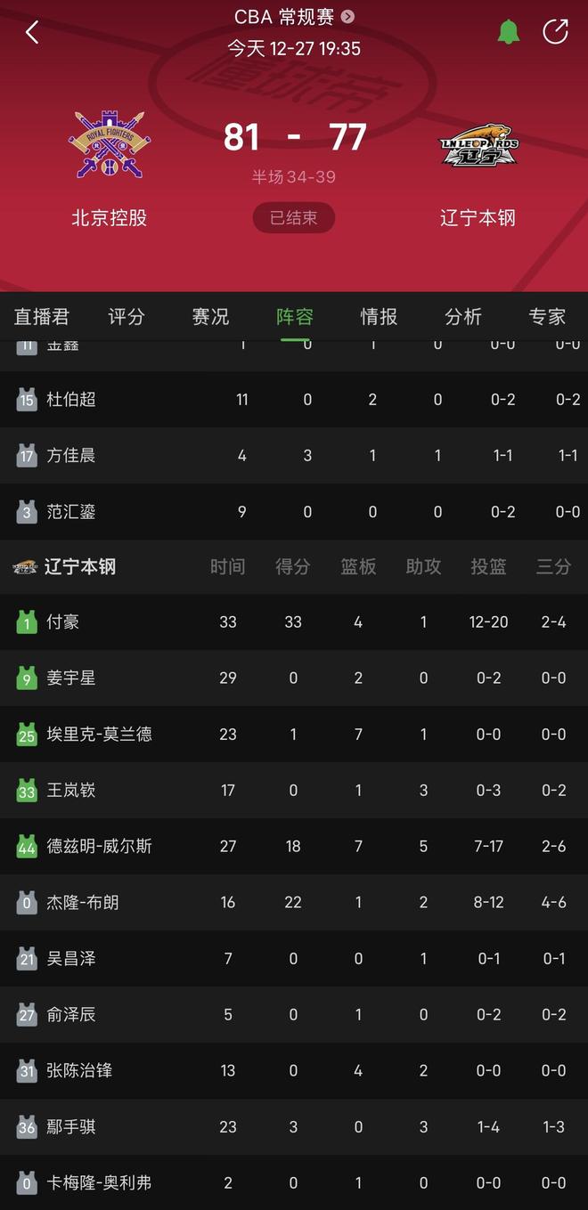 北京時(shí)間今日,在CBA常規(guī)賽中,遼寧本鋼在客場以77-81不敵北京控股。