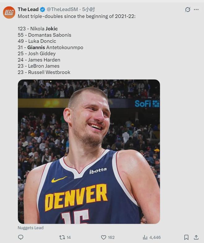 ESPN今天曬出一組數(shù)據(jù),最近五個賽季三雙排行榜:約基奇123次遙遙領先;小薩博尼斯55次聯(lián)盟第二;東契奇49次排名第三;字母哥31次排第四;吉迪25次排第五;哈登24次排第六;威少和詹姆斯都是23次,并列第七。