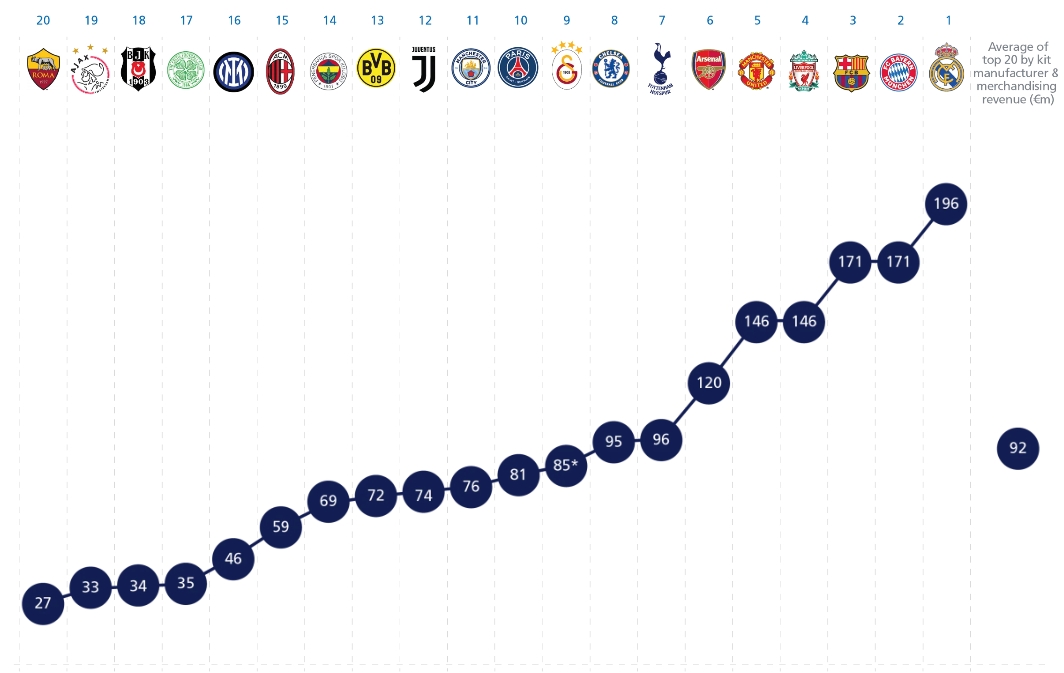 2024歐洲俱樂部球衣和商品收入排行(單位:歐元):