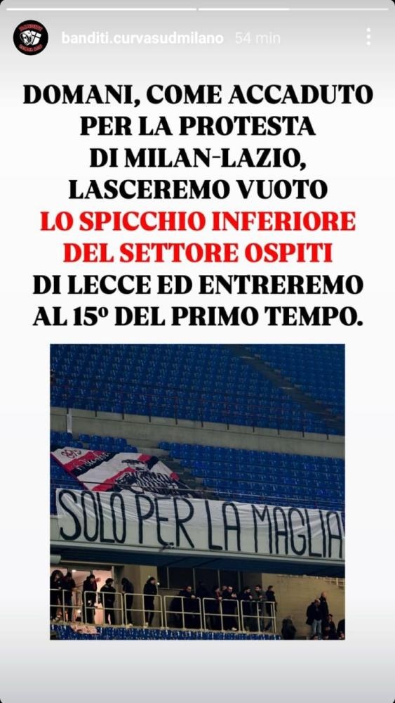 米蘭南看臺(tái)球迷組織在社交平臺(tái)上宣布:“明天,就像米蘭-拉齊奧時(shí)發(fā)生的抗議一樣,我們將會(huì)在萊切球場(chǎng)客隊(duì)坐區(qū)制造一片空?qǐng)?,我們將?huì)從上半場(chǎng)第15分鐘再進(jìn)場(chǎng)?!?/p>