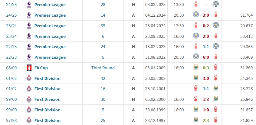 諾丁漢森林上一次在聯(lián)賽擊敗曼城還是在1997年12月,當(dāng)時(shí)他們?cè)谟⒓?-2戰(zhàn)勝曼城。而上一次諾丁漢森林在英超聯(lián)賽擊敗曼城則已經(jīng)要追溯到近30年前。
