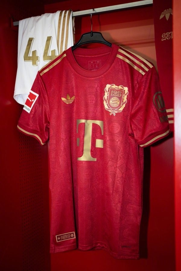 這款獨特的特別版球衣延續(xù)了傳統(tǒng)的紅色,并配以金色的品牌標志。此外所設計的紀念徽章則融入了成立文件中的元素、盾形紋章以及巴伐利亞的月桂花環(huán)元素,金色的細節(jié)則為設計增添了現(xiàn)代感。
