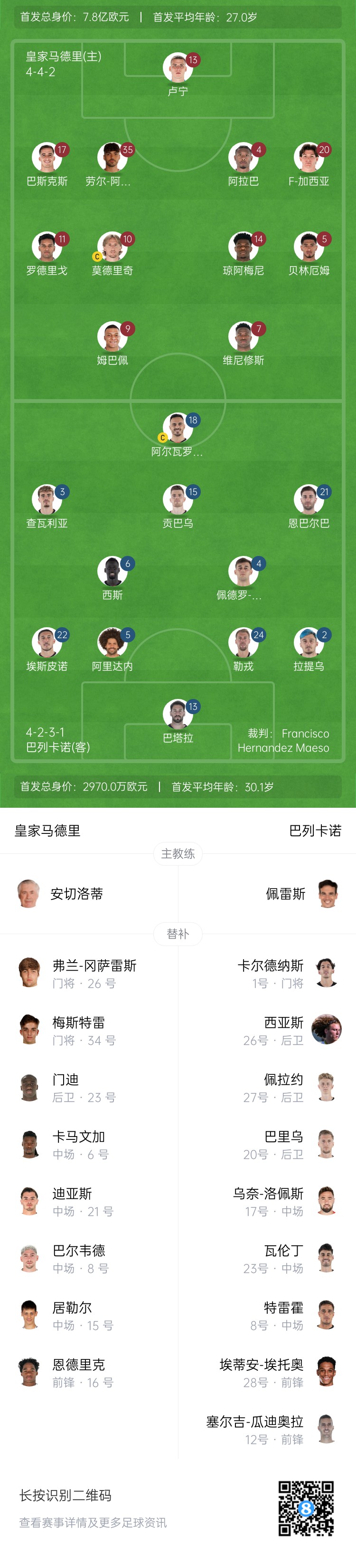 皇馬替補(bǔ):34-梅斯特雷、26-弗蘭-岡薩雷斯、6-卡馬文加、8-巴爾韋德、15-居勒爾、16-恩德里克、21-迪亞斯、23-費(fèi)蘭-門迪