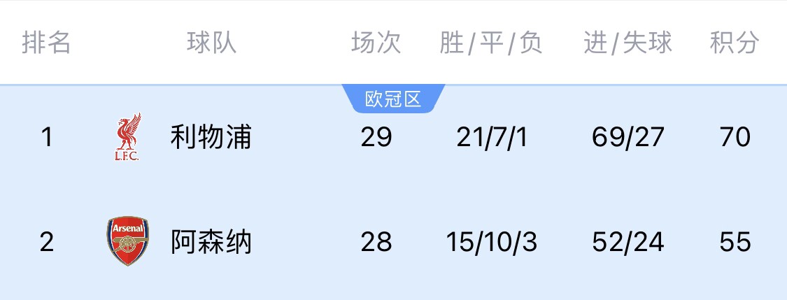 如果利物浦贏得接下來(lái)的兩場(chǎng)比賽,拿到76分;而阿森納恰好四連敗,即4月13日21:00利物浦主場(chǎng)迎戰(zhàn)西漢姆之前,紅軍已提前鎖定冠軍。