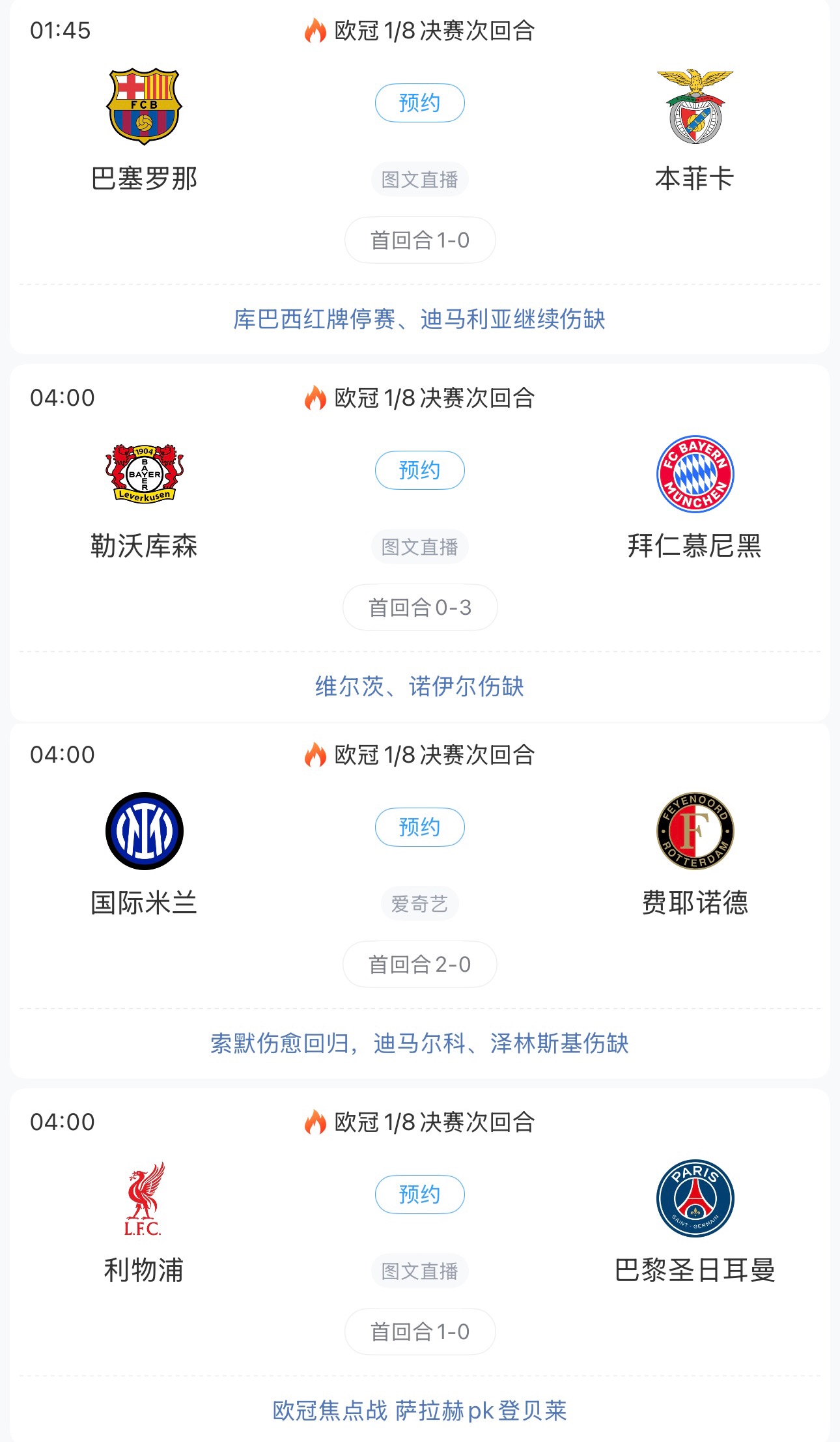 北京時(shí)間明天凌晨,歐冠1/8決賽次回合開打,利物浦大戰(zhàn)巴黎,薩拉赫與登貝萊繼續(xù)“金球之爭(zhēng)”,拜仁與勒沃庫(kù)森上演德甲內(nèi)戰(zhàn),巴薩、國(guó)米出戰(zhàn)。四組對(duì)陣中會(huì)不會(huì)出現(xiàn)逆轉(zhuǎn)?今晚拭目以待!