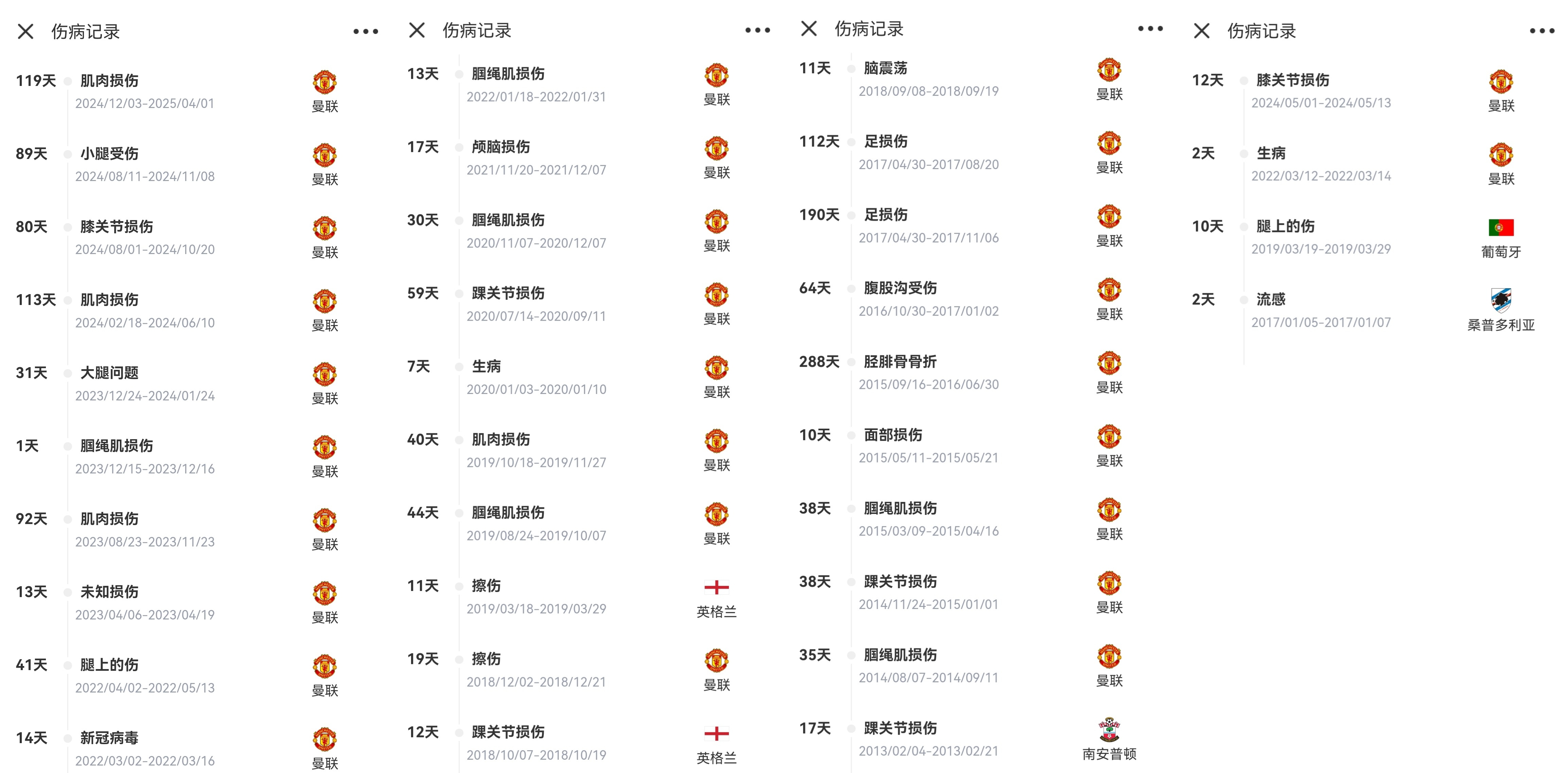 以下為盧克肖和B費生涯因傷缺陣的情況,左邊三頁是盧克肖的,右邊一頁是B費的。