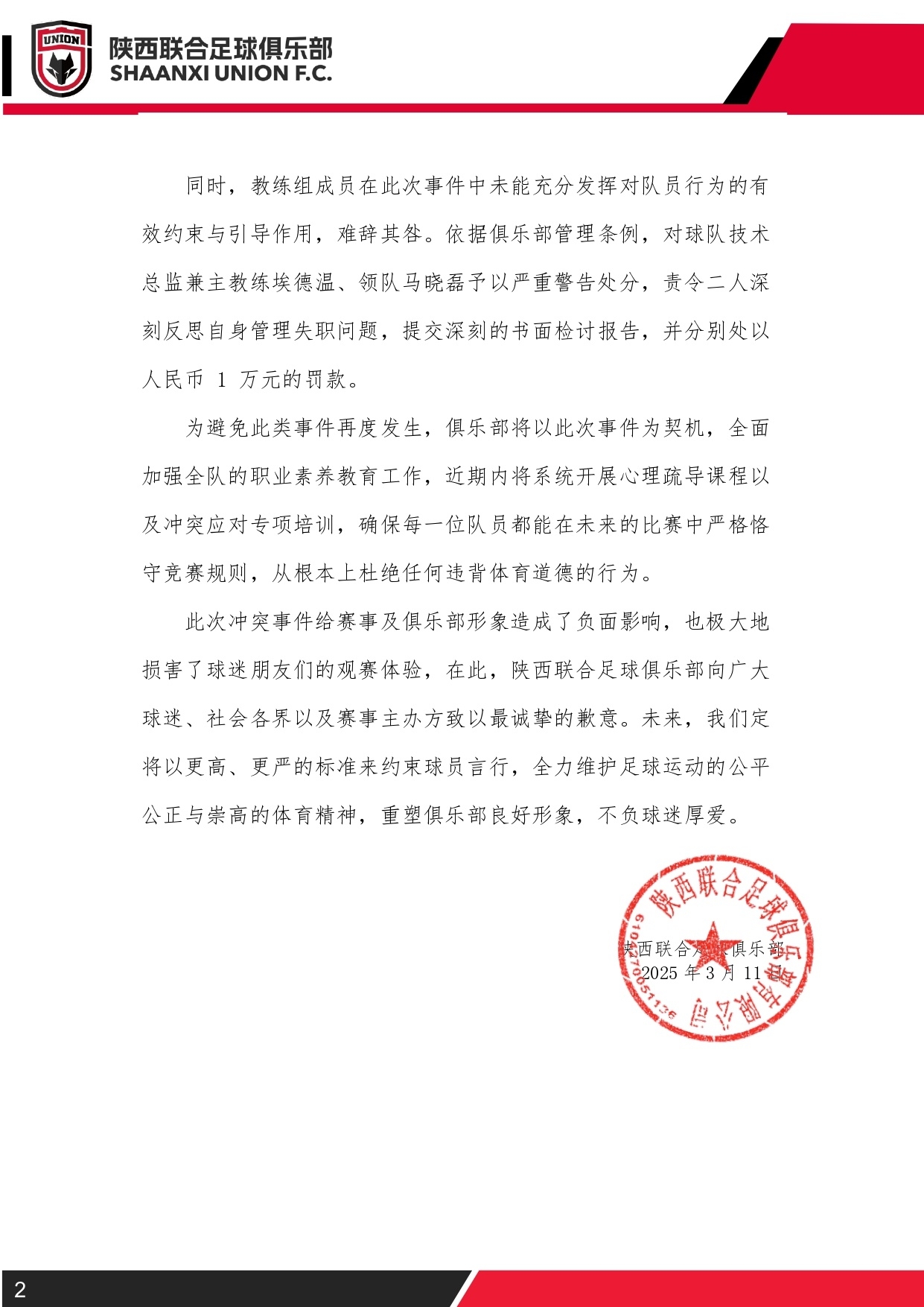 同時(shí),教練組成員在此次事件中未能充分發(fā)揮對(duì)隊(duì)員行為的有效約束與引導(dǎo)作用,難辭其咎。依據(jù)俱樂(lè)部管理?xiàng)l例,對(duì)球隊(duì)技術(shù)總監(jiān)兼主教練埃德溫、領(lǐng)隊(duì)馬曉磊予以嚴(yán)重警告處分,責(zé)令二人深刻反思自身管理失職問(wèn)題,提交深刻的書(shū)面檢討報(bào)告,并分別處以人民幣1萬(wàn)元的罰款。