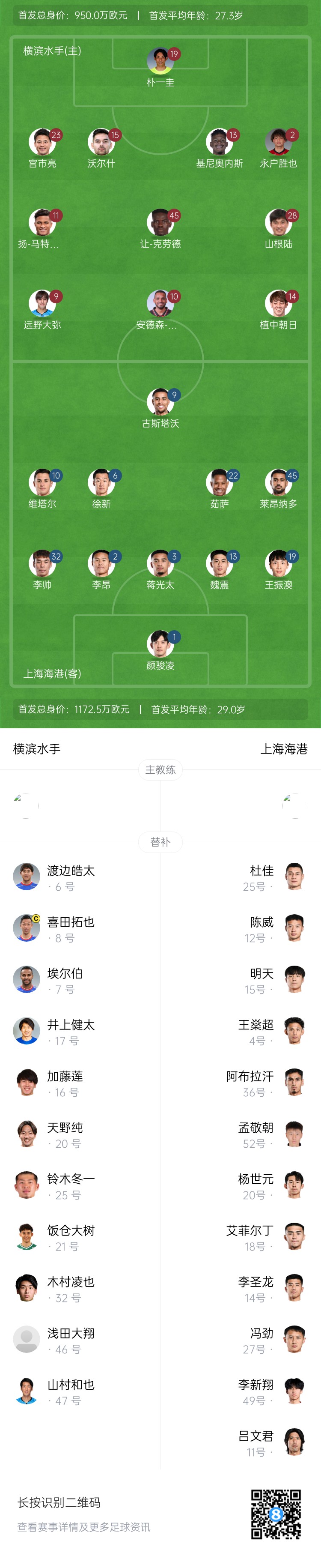 上海海港替補:12-陳威、25-杜佳、4-王燊超、15-明天、20-楊世元、21-艾菲爾丁-艾斯卡爾、11-呂文君、36-阿布拉汗-哈力克、52-孟敬朝、14-李圣龍、27-馮勁、49-李新翔