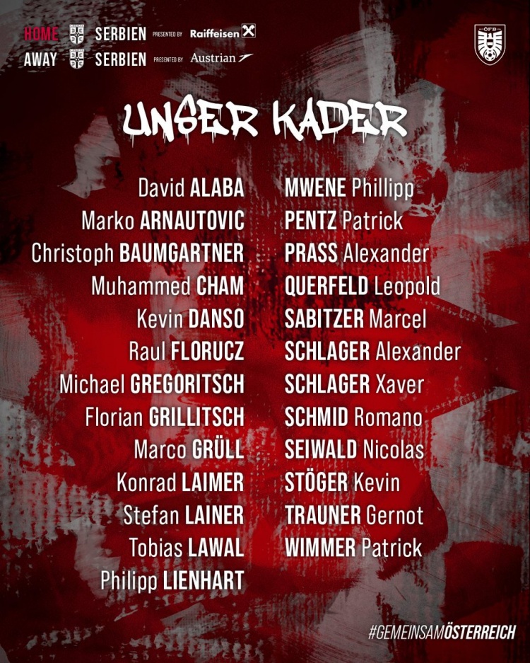奧地利名單:阿拉巴領(lǐng)銜,阿瑙托維奇、薩比策、萊默爾、丹索在列