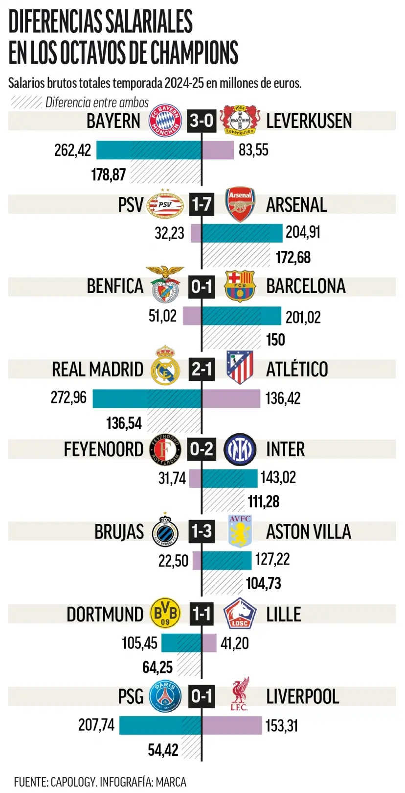 根據(jù)足球財(cái)務(wù)專業(yè)網(wǎng)站Capology的數(shù)據(jù),如果以球員薪資支出為標(biāo)準(zhǔn),最不平衡的淘汰賽是對(duì)陣拜仁和勒沃庫(kù)森的比賽,拜仁的薪資支出幾乎是對(duì)手的三倍(2.624億歐元對(duì)8350萬(wàn)歐元)。第二大差距出現(xiàn)在阿森納與埃因霍溫的對(duì)決中,阿森納球員的2.049億歐元薪資遠(yuǎn)超埃因霍溫的3220萬(wàn)歐元,差距高達(dá)六倍。第三個(gè)薪資差距較大的對(duì)決是本菲卡與巴塞羅那,巴薩球員的薪水是葡萄牙球隊(duì)的四倍(2.01億歐元對(duì)5100萬(wàn)歐元)?;蜀R與馬競(jìng)的陣容薪資差距恰好是兩倍,皇馬為2.729億歐元,馬競(jìng)為1.364億歐元。