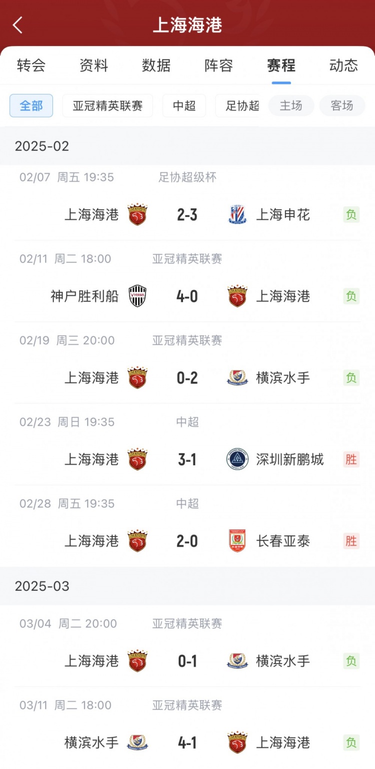 這7場(chǎng)比賽中,海港隊(duì)輸?shù)袅似渲?場(chǎng),這造成球隊(duì)痛失超級(jí)杯冠軍,以及在亞冠精英聯(lián)賽止步于16強(qiáng)。不過(guò)在中超聯(lián)賽中,海港隊(duì)取得連勝,且2場(chǎng)聯(lián)賽僅失1球。