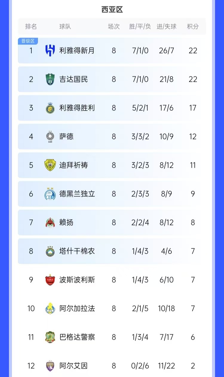 其中利雅得新月首回合0-1落敗但是次回合干脆利落4-0解決戰(zhàn)斗,利雅得勝利首回合0-0打平次回合同樣3-0輕松拿下,吉達國民則是兩回合直接雙殺對手晉級。此外這三隊也是聯(lián)賽階段西亞區(qū)的前三名,積分斷層領先。