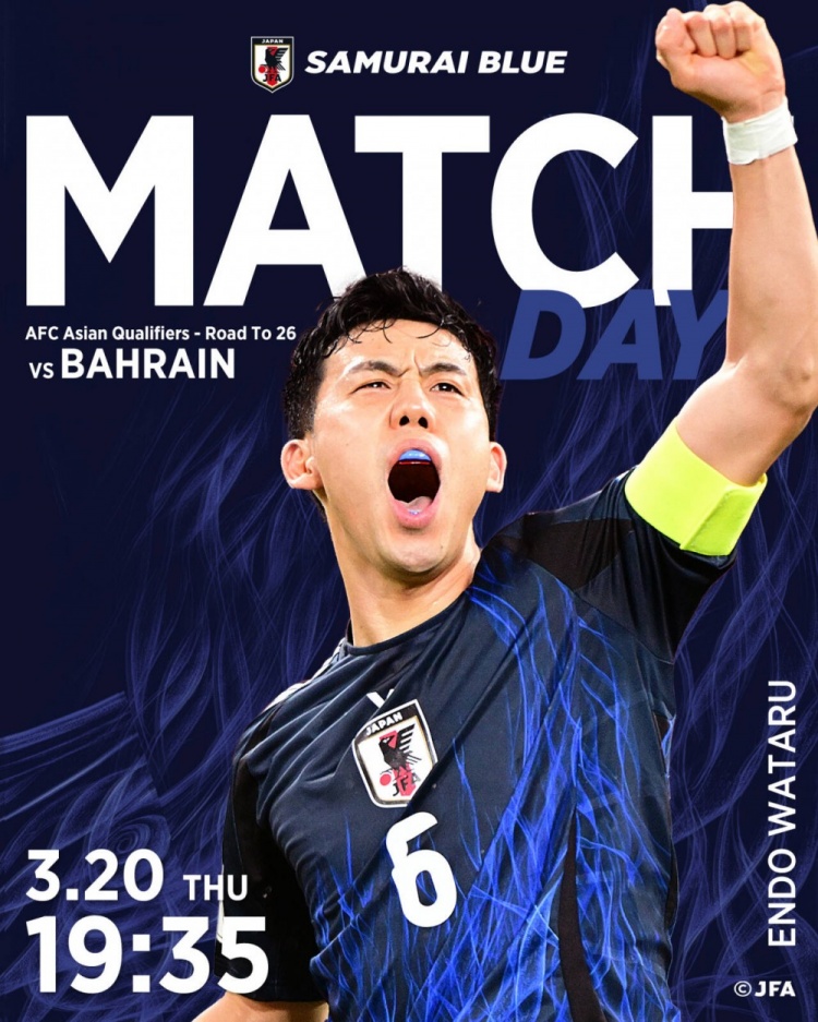 日本隊公布戰(zhàn)巴林海報:隊長遠藤航單人入鏡,振臂高呼