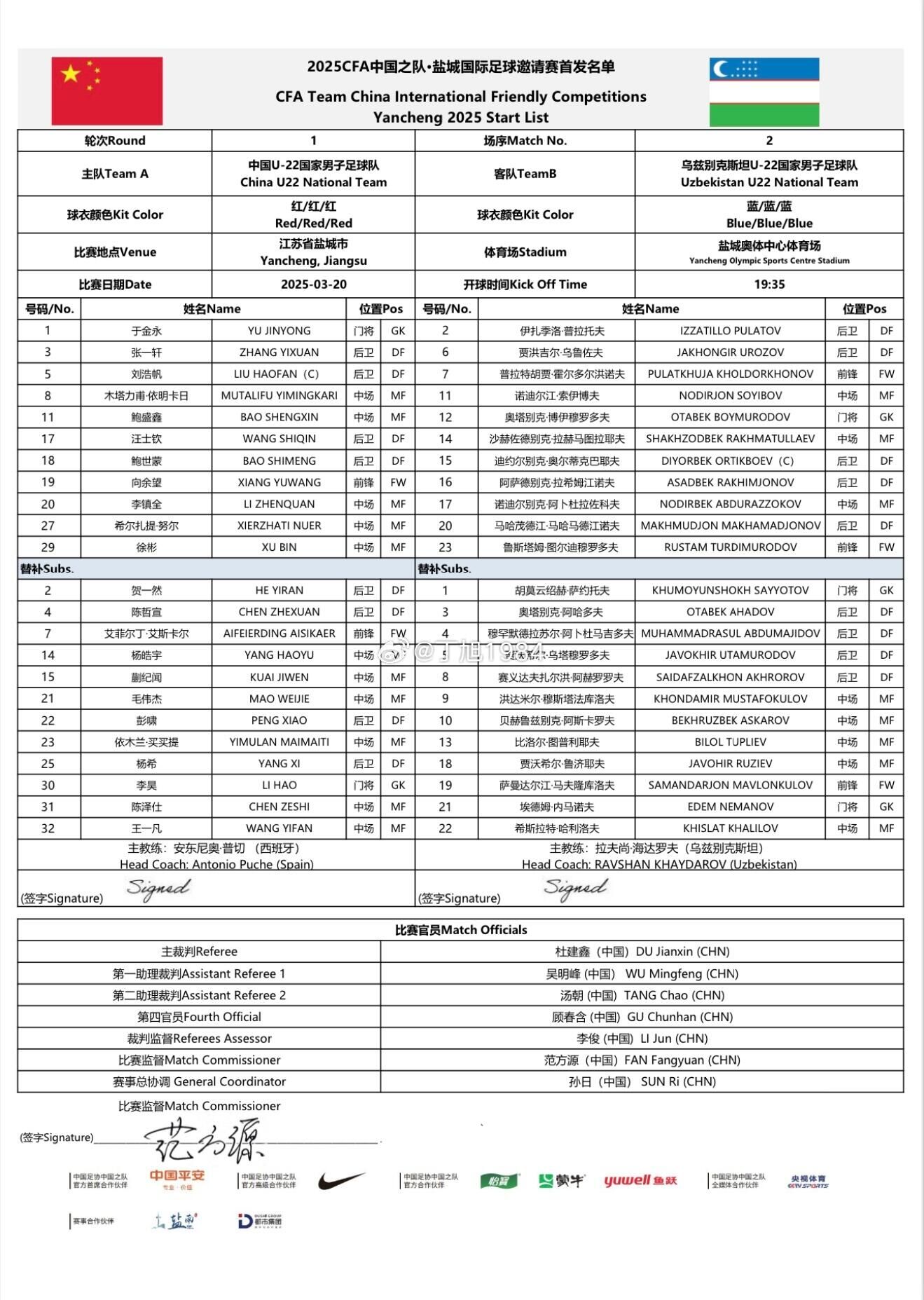03月20日訊 2025CFA中國(guó)之隊(duì)·鹽城國(guó)際足球邀請(qǐng)賽,中國(guó)男足U22vs烏茲別克斯坦U22,賽前雙方首發(fā)公布!此前從國(guó)家隊(duì)集訓(xùn)回歸的徐彬、汪士欽、劉浩帆先發(fā)出戰(zhàn)。