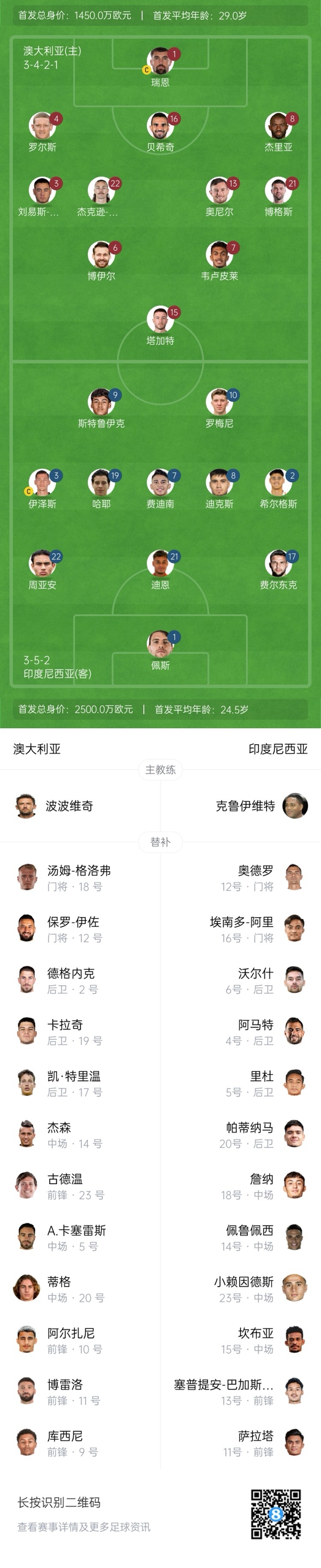 國足同組!澳大利亞vs印尼首發(fā):印尼先發(fā)10名歸化 古德溫蒂格替補(bǔ)