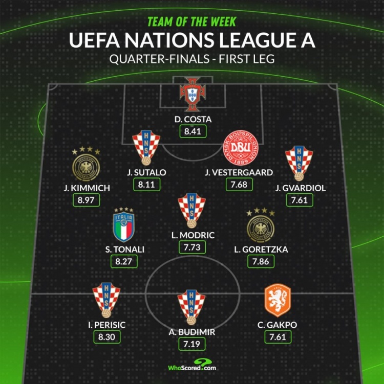 3月21日訊 歐國(guó)聯(lián)A級(jí)別八強(qiáng)戰(zhàn)首回合已經(jīng)完賽,whoscored也列出了本輪評(píng)分最佳陣容,克羅地亞5將在列。