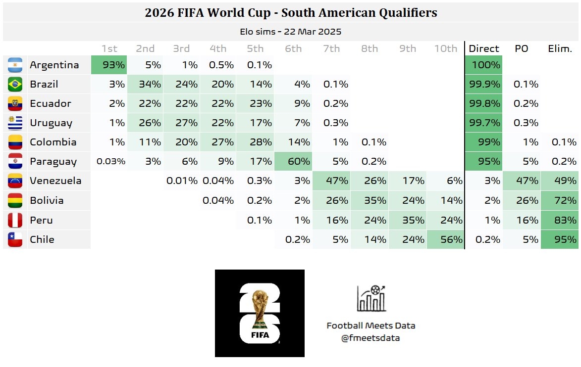 世預(yù)南美晉級概率:阿根廷100%直通世界杯,巴西等5隊也基本鎖定