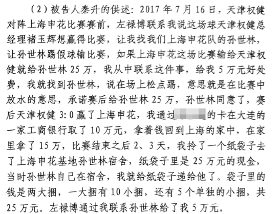 網(wǎng)傳秦升供述:拎紙袋子去了申花基地孫世林宿舍,里面是25萬現(xiàn)金