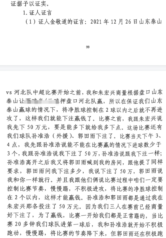 金敬道證言:踢河北我和孫準(zhǔn)浩、郭田雨各下注50萬(wàn),一起控制節(jié)奏