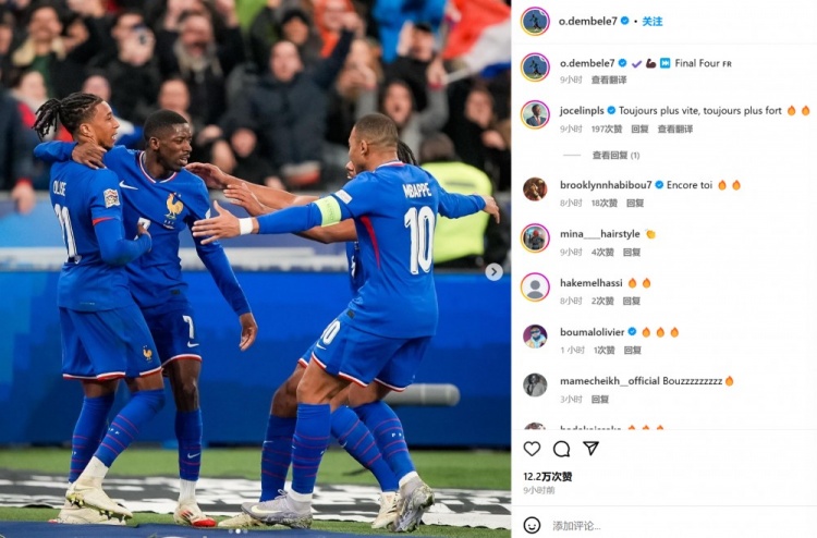 而取得進(jìn)球的登貝萊也曬出和隊(duì)友相擁慶祝的合照并表示:“????????????晉級(jí)四強(qiáng)”。