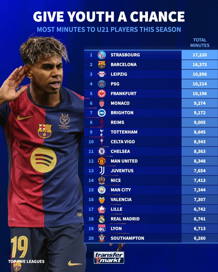 3月24日訊 德轉(zhuǎn)統(tǒng)計了本賽季五大聯(lián)賽球隊中,U21球員出場時間最多的前20支球隊。其中,切爾西的“衛(wèi)星隊”斯特拉斯堡高居榜首,巴薩和萊比錫分別排在第二和第三。