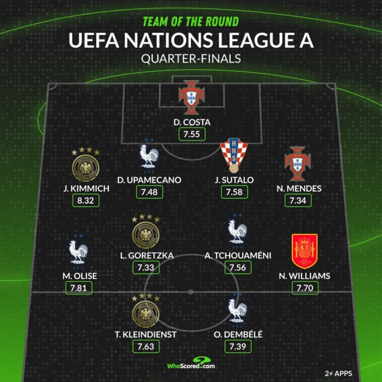 WhoScored評歐國聯(lián)四分之一決賽最佳陣:法國四將入圍