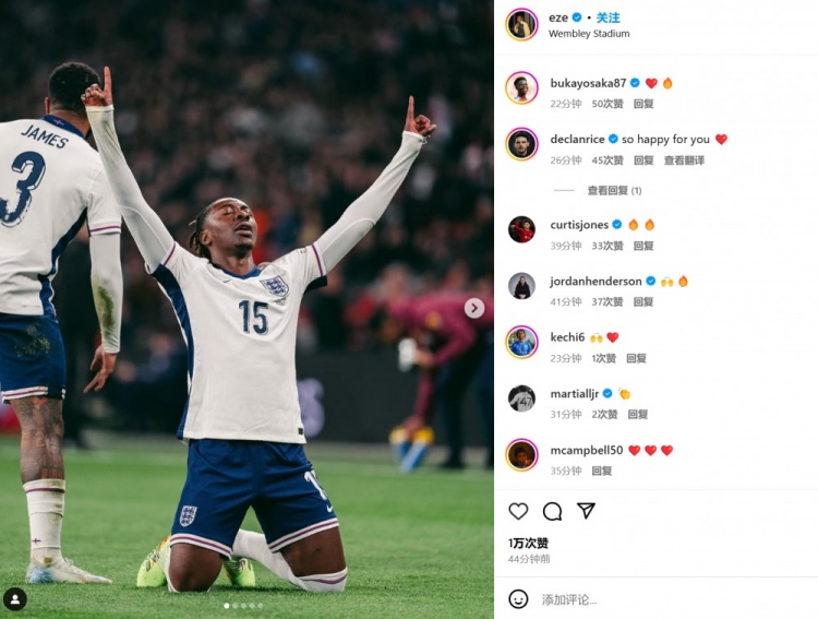 兩人也都在賽后通過社媒曬出自己的比賽照,但并未附加文字內(nèi)容。賴斯和霍爾等隊友紛紛送上鼓勵:“為你感到高興”、“棒極了”…
