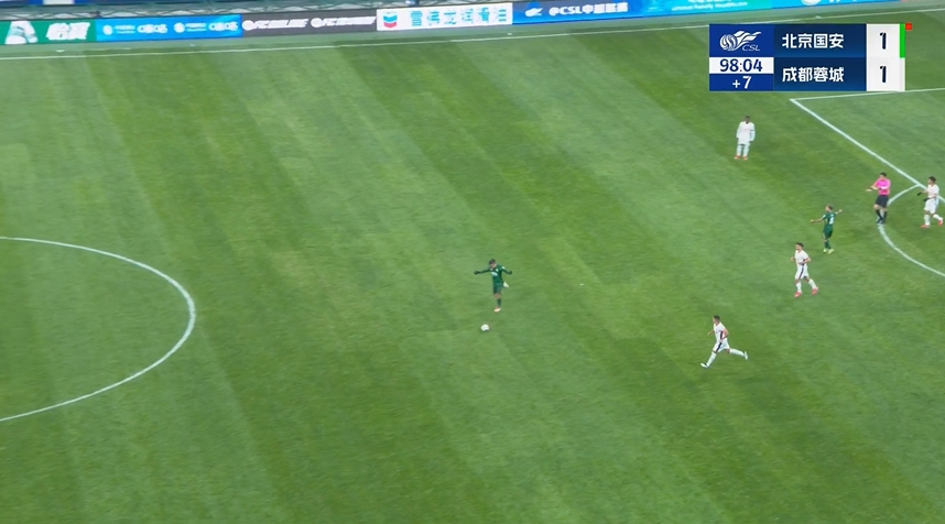 成都最后禁區(qū)外射門和彈子球一樣亂彈了幾下,先是彈到了馬寧腿上,然后又彈向國安進攻方面,張玉寧得到球……