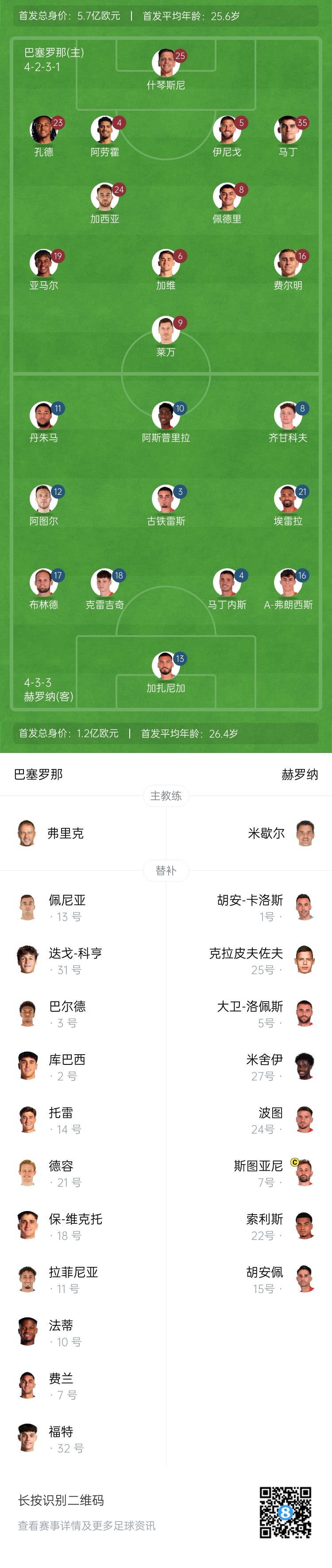 巴薩首發(fā):25-什琴斯尼、4-阿勞霍、5-伊尼戈-馬丁內斯、23-孔德、24-埃里克-加西亞、35-杰拉德-馬丁、6-加維、8-佩德里、16-費爾明、19-亞馬爾、9-萊萬
