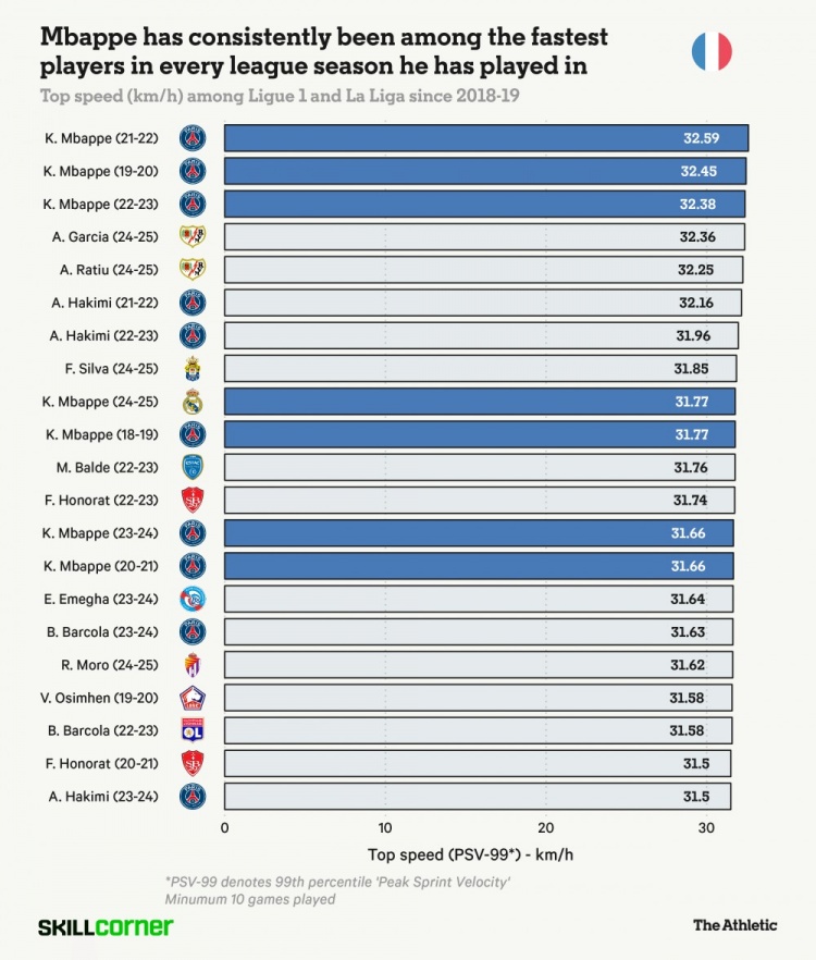 自2018/2019賽季以來,法甲和西甲聯(lián)賽中速度最快球員統(tǒng)計