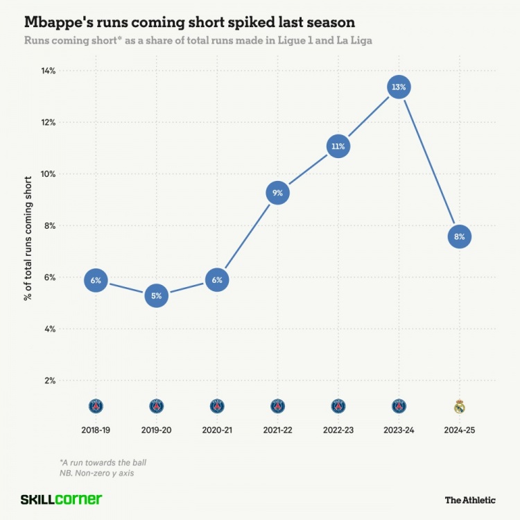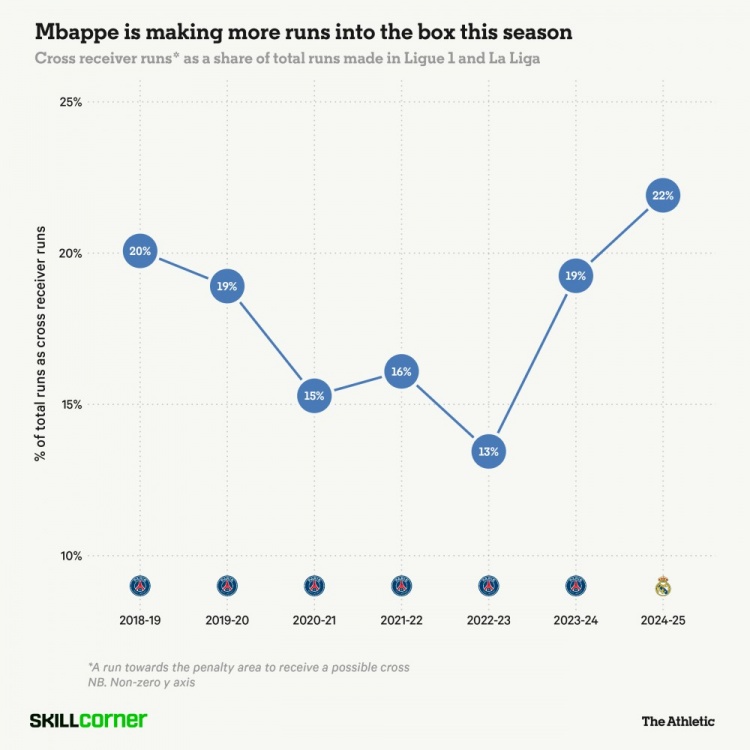 姆巴佩向更傳統(tǒng)的中鋒演變,則是在他轉(zhuǎn)會到皇馬之后,進入了快車道。