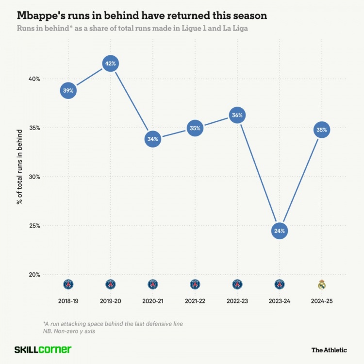 姆巴佩本賽季又開始頻繁地進行身后跑位了