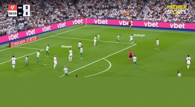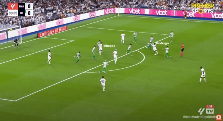 當羅德里戈從右路帶球內(nèi)切之時,姆巴佩背對著球門,以便更好地創(chuàng)造進攻空間……