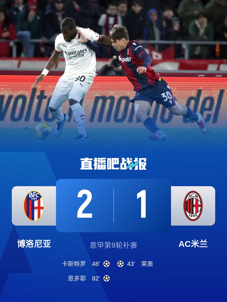 萊奧破門(mén),米蘭1-2遭博洛尼亞逆轉(zhuǎn),意甲兩連敗跌至第8名。