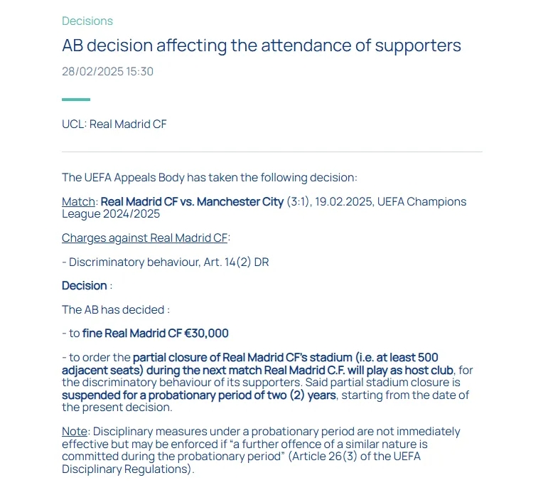 根據(jù)裁決書(shū):“若皇馬球迷在未來(lái)兩年觀察期內(nèi)再次出現(xiàn)類(lèi)似違規(guī)行為,將立即執(zhí)行部分看臺(tái)關(guān)閉措施?!痹撚^察期自2月28日裁決公布之日起計(jì)算。除看臺(tái)關(guān)閉警告外,歐足聯(lián)還同步開(kāi)出了立即生效的3萬(wàn)歐元罰單。